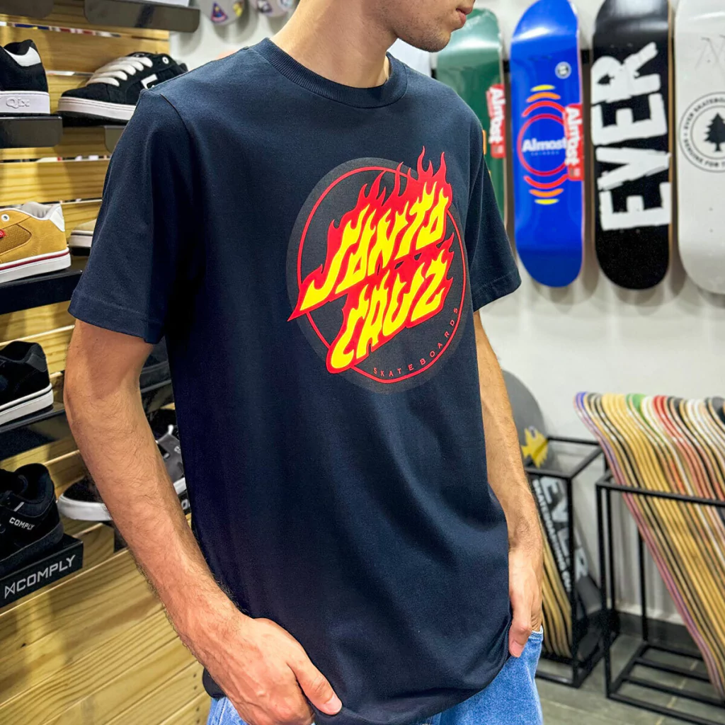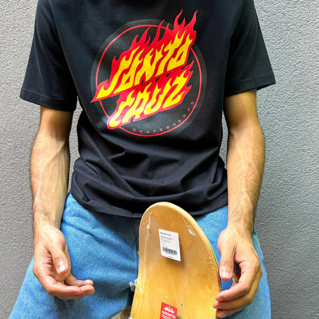 A camiseta Santa Cruz Flaming Dot Front Black, apresenta uma estampa clássica da marca mas com um toque radical, com chamas de fogo sobre a logo. Essa camiseta pode ser facilmente combinada com variedade de peças, sendo ideal para quem aprecia esse estilo do skate, uma camiseta leve, confortável e alta qualidade.