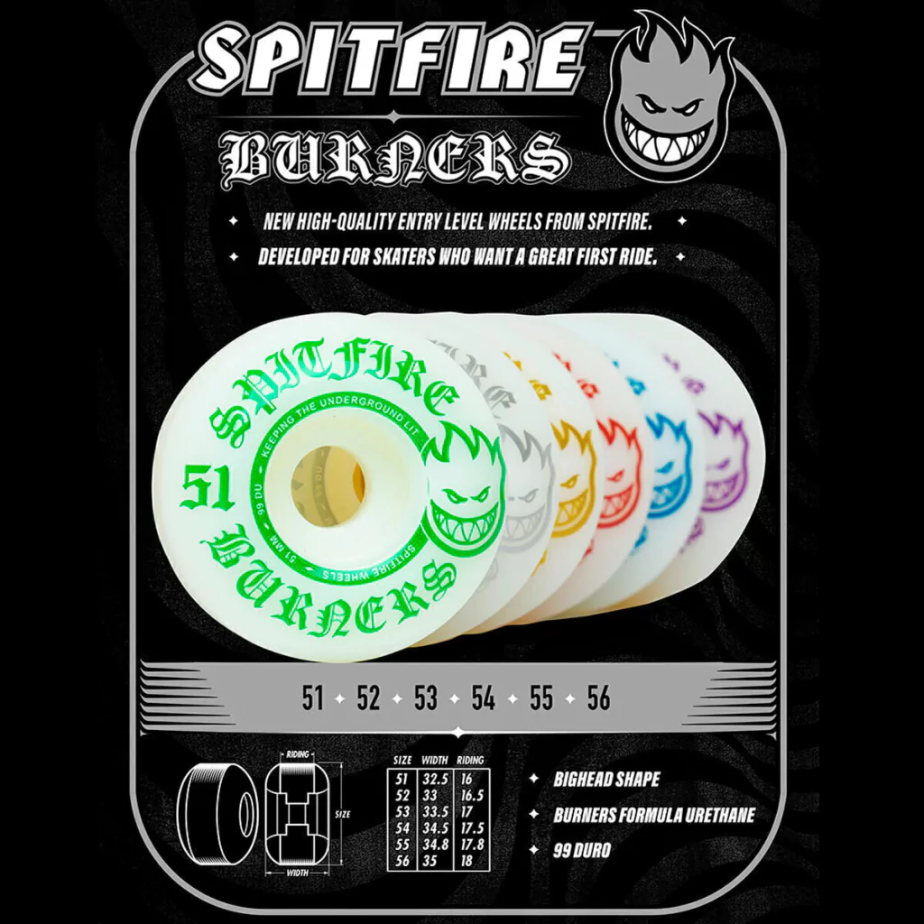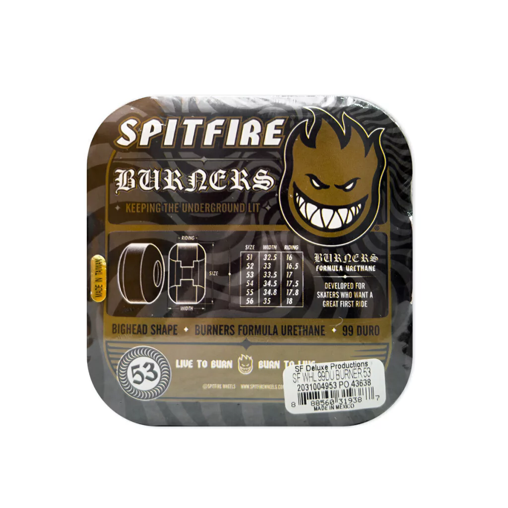 O modelo "Burners" da Spitfire possui uma formula de Uretano própria e diferentes dos outros modelos, essa formula garante que a roda fique com a dureza ideal e tenha um ótimo desempenho em todos os terrenos do skate street.
