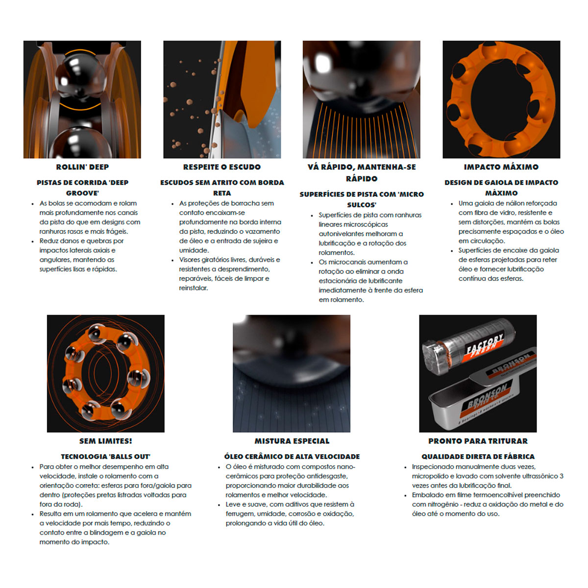 A Tecnologia Balls Out elimina o contato entre o escudo e a gaiola durante impactos, evitando perda de rotação e mantendo o rolamento sempre rápido. A lubrificação exclusiva de alta velocidade é resistente à água, oxidação e corrosão, protegendo o rolamento contra desgaste prematuro. Além disso, os rolamentos vêm diretamente da fábrica, embalados em invólucro termoencolhível preenchido com nitrogênio, preservando óleo e metal até o momento do uso.