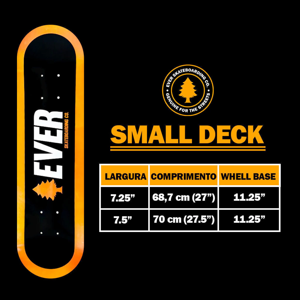 Os "Small Decks" são projetados com medidas menores para atender skatistas de forma proporcional a sua necessidade. Sendo mais estreito, mais curto, mais leve e com wheelbase menor em comparação aos shapes comuns, esse deck tem tudo para proporcionar um rolê de excelente qualidade para crianças e adultos que desejam um skate pequeno.
