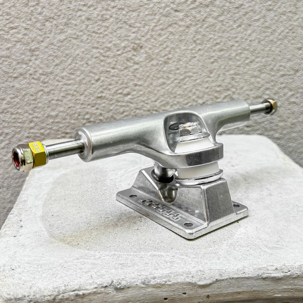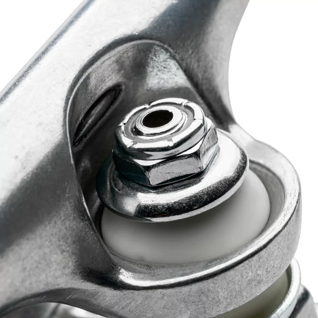Esses novos trucks são fabricados com liga AA 356.2 de alta qualidade usando o método de fundição próprio, com placas de base e suportes com tratamento térmico True T6. Os eixos possuem liga de aço SAE 4140, superdimensionados para eliminar oscilações do rolamento e um amortecedor de uretano macio moldado manualmente para melhor resposta em seu rolê.
