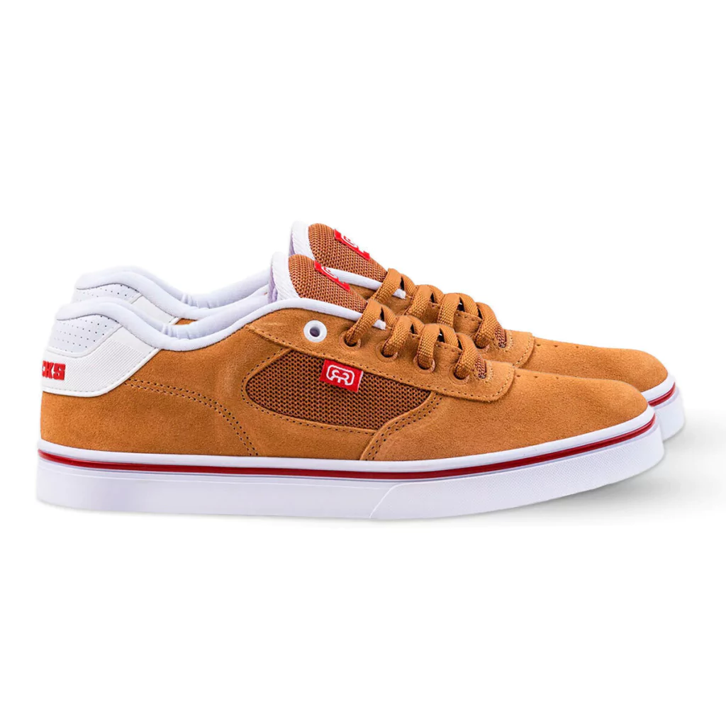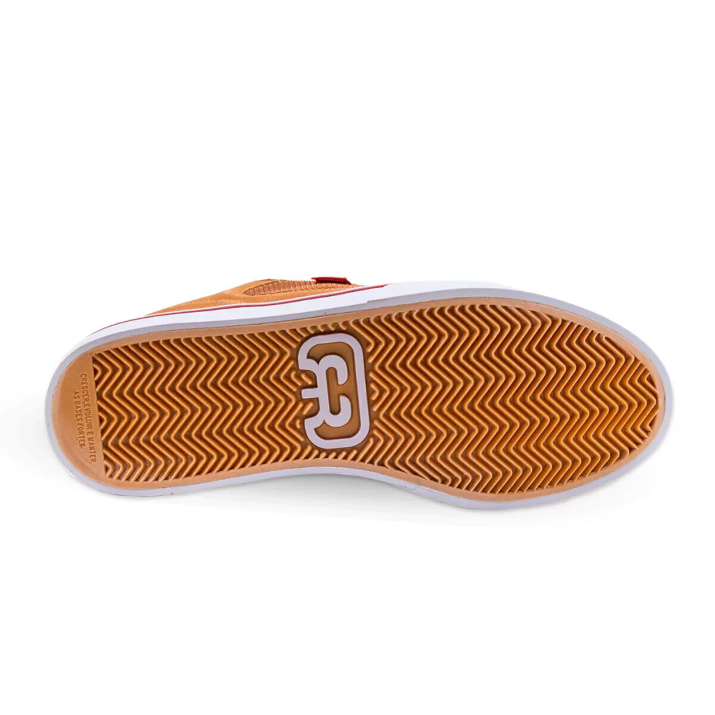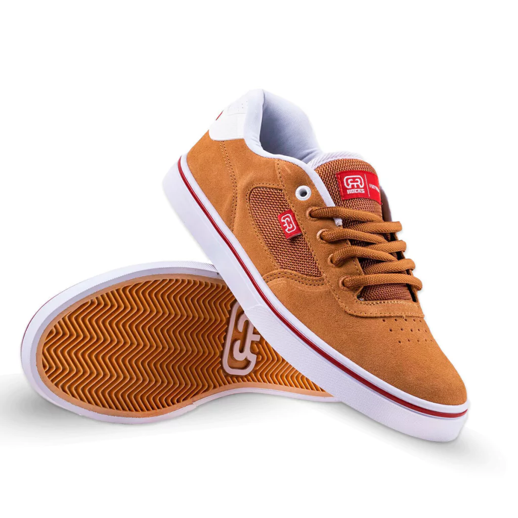 Esse modelo possuí cabedal em suede natural (camurça) mesclado com sintético P.U perfurado e nylon esportivo 100% poliéster e a logo aplicada em etiquetas de tafetá plus, a sua cor camel conhecida por permitir várias combinações desde algo neutro/básico até algo mais sofisticado! O tom vermelho traz um design único para esse modelo por onde passar.